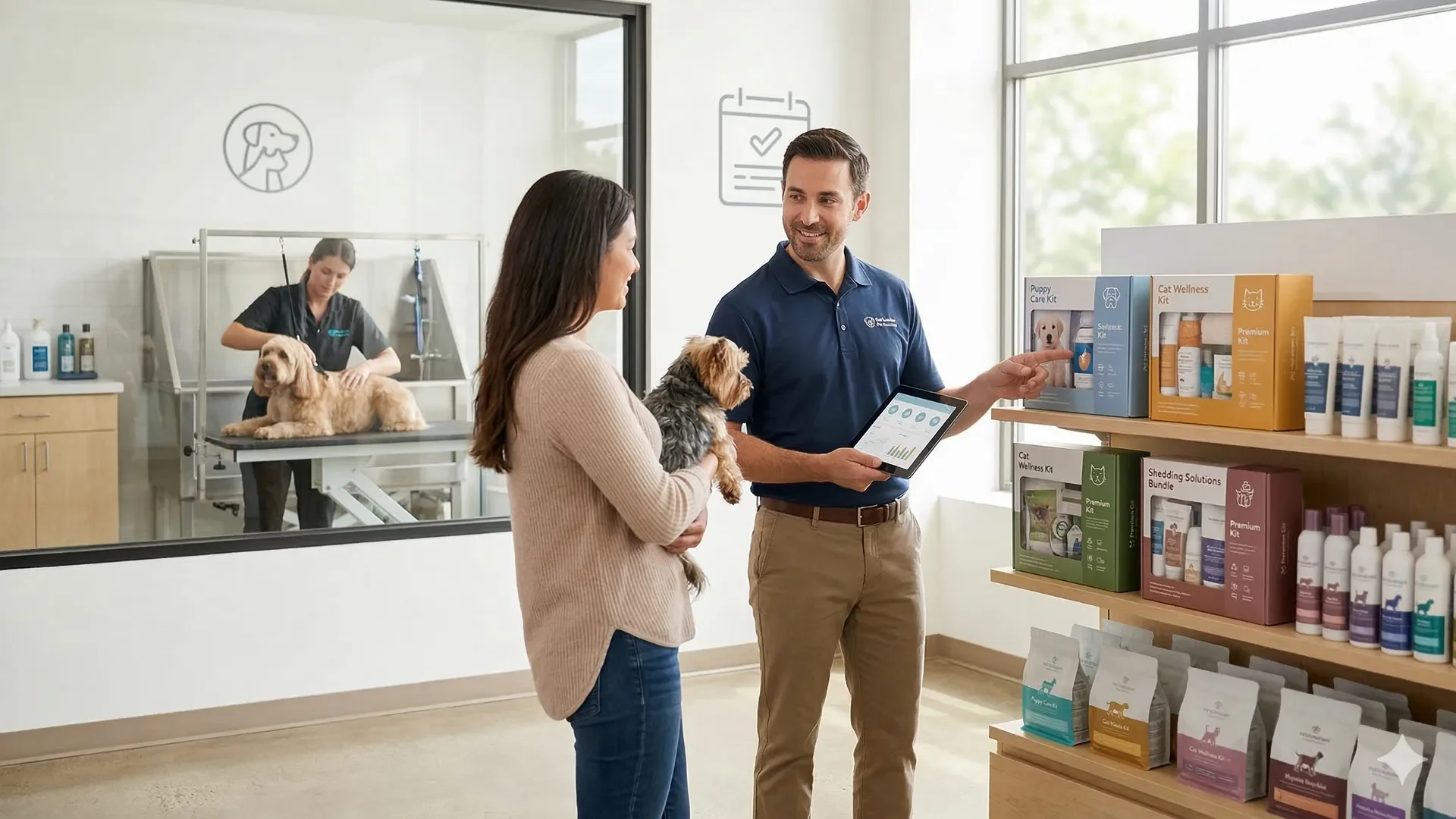 Na abordagem comercial, a regra é não “empurrar” serviço. A equipe deve observar o animal e traduzir isso em benefício objetivo para o tutor. Em vez de perguntar se ele “quer adicionar hidratação”, funciona melhor dizer algo como: “Percebemos a pelagem mais opaca e com nós na região do peito; hoje faz sentido incluir um protocolo de hidratação e desembolo para reduzir quebra e facilitar a manutenção em casa”. A venda melhora quando parte de uma dor concreta, não de um script genérico.